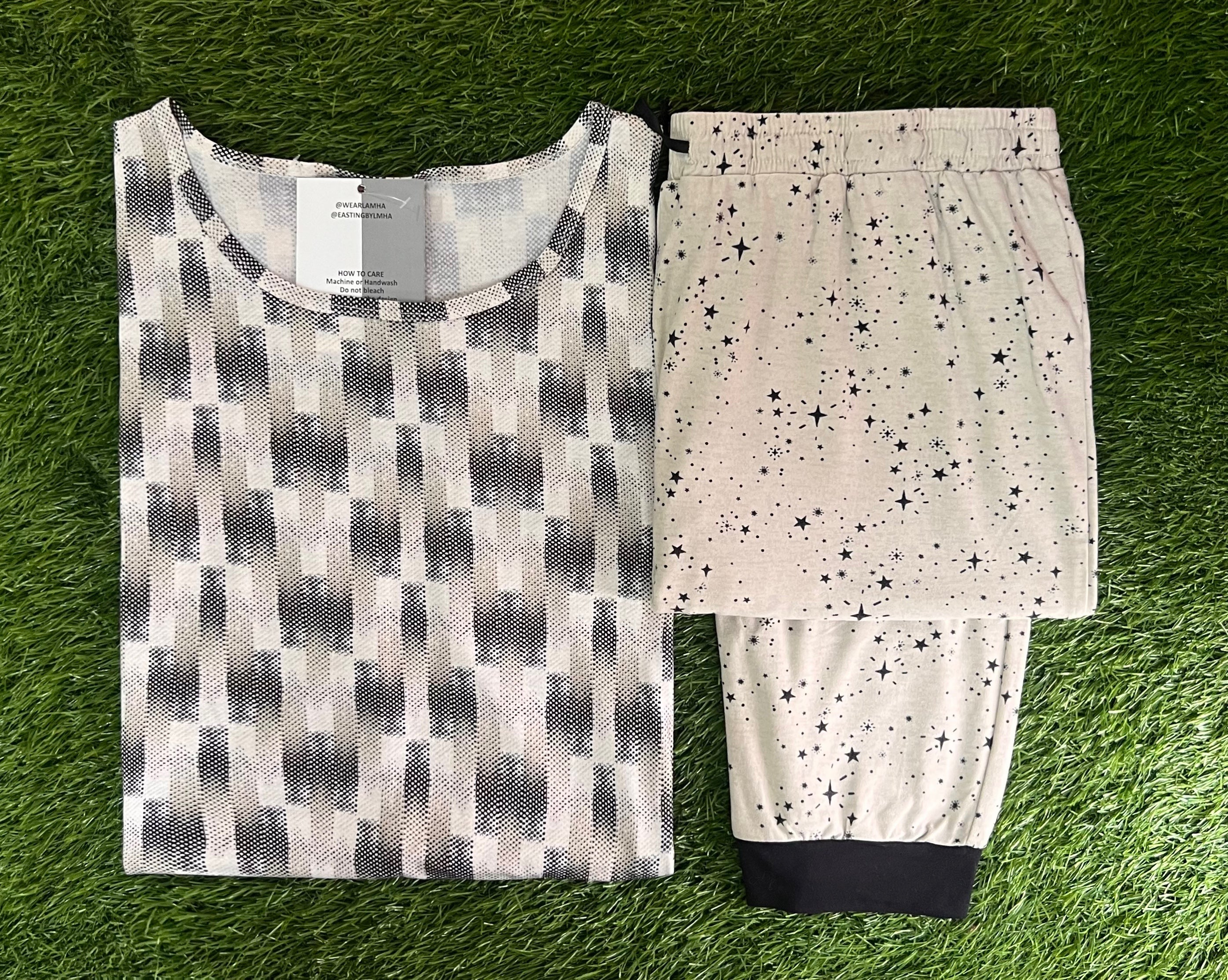 The long tee provides a relaxed, cozy fit perfect for lounging, while the matching pajama bottoms ensure all-day ease and style.