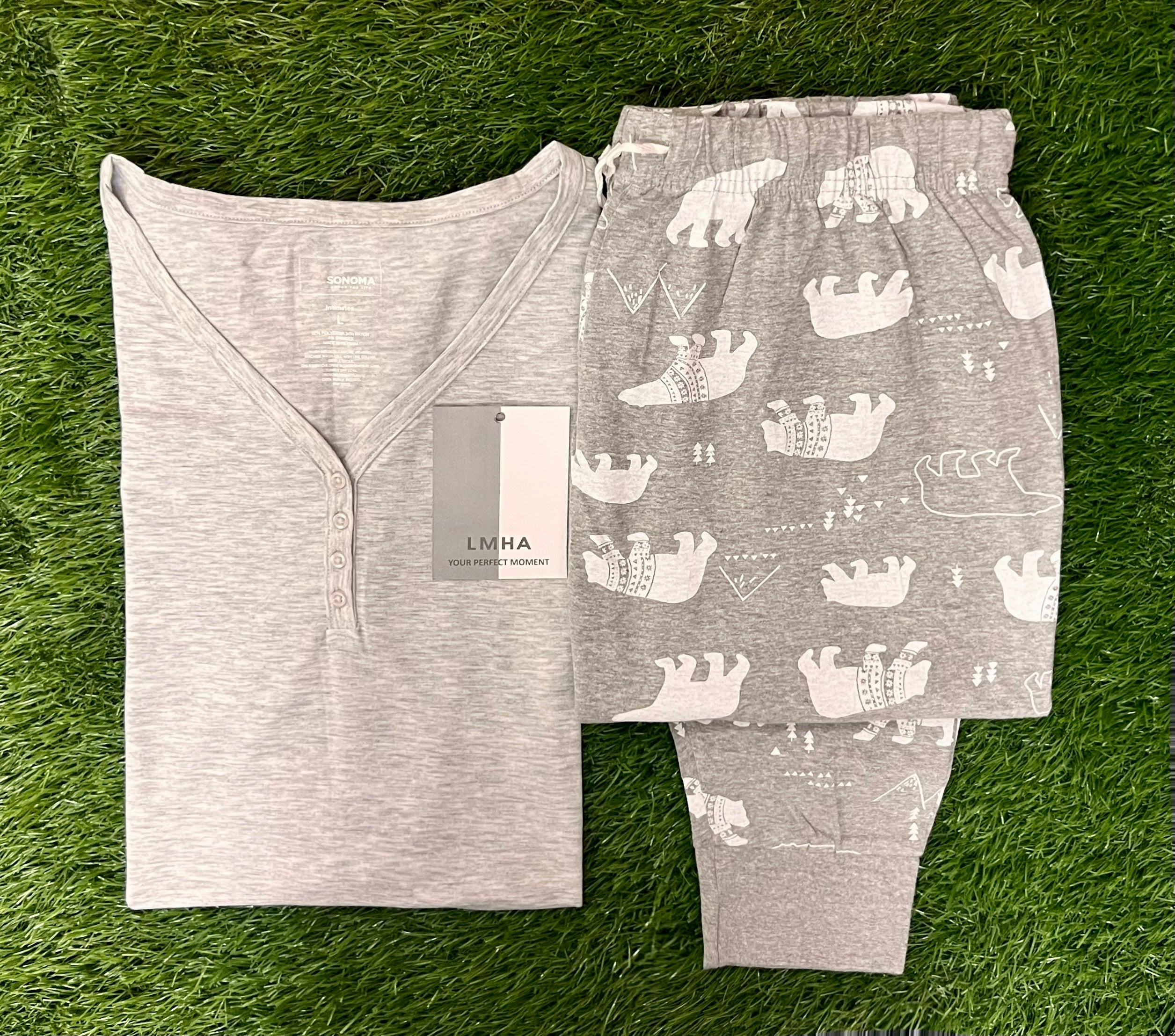 The long tee provides a relaxed, cozy fit perfect for lounging, while the matching pajama bottoms ensure all-day ease and style.